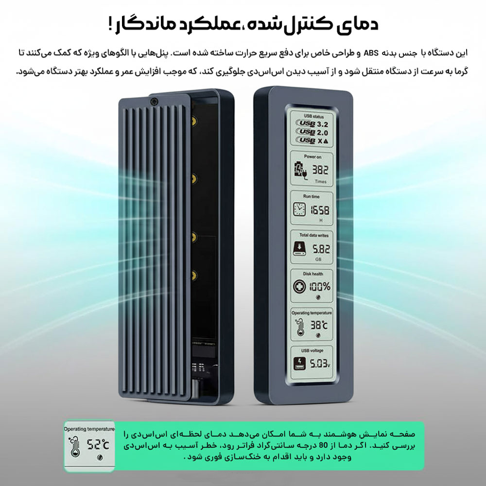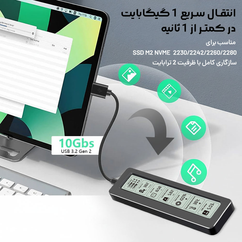 باکس اساسدی M2 NVME مدل Shuole TP26-pبا صفحه نمایشی کاربردی، به شما این امکان را میدهد تا به راحتی اطلاعات مهم را نظارت کنید.